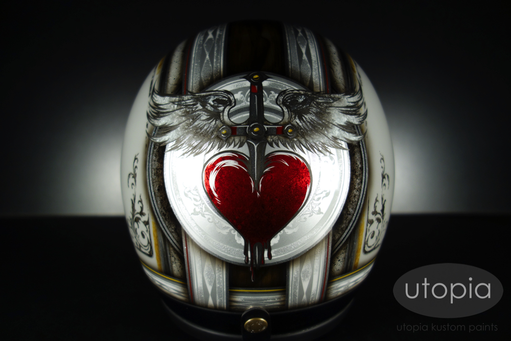 バックにハート&ダガーのロゴを配置し、その周りを手の込んだテクスチャーペイントで装飾しました。
