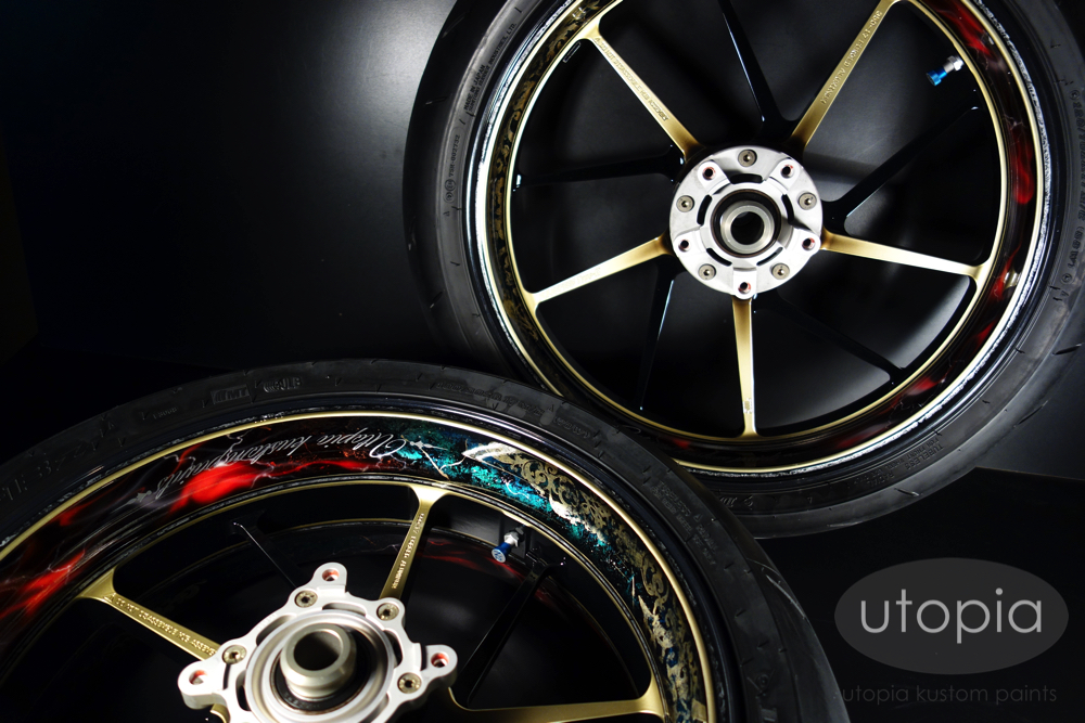 以前オールペイントさせて頂いたオーナー様から追加でホイールのカスタムペイントをご依頼いただきました。 ボディより少しカラーを追加して車体ペイントとの区別をつけていますが、繊細なデザインと深い色味と質感は車体ペイント同様で見事にマッチしています。 ホイールカスタムはサイズアップやメッキが多いですが、ペイントでのカスタムもホイールの存在感がグンと増します。